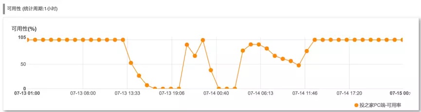 7月13日晚上20:00,在技术团队进行了故障处理后,网站开始恢复,可用性逐渐上升,但是访问压力重新进来,在7月14日凌晨01:00再次降到零。