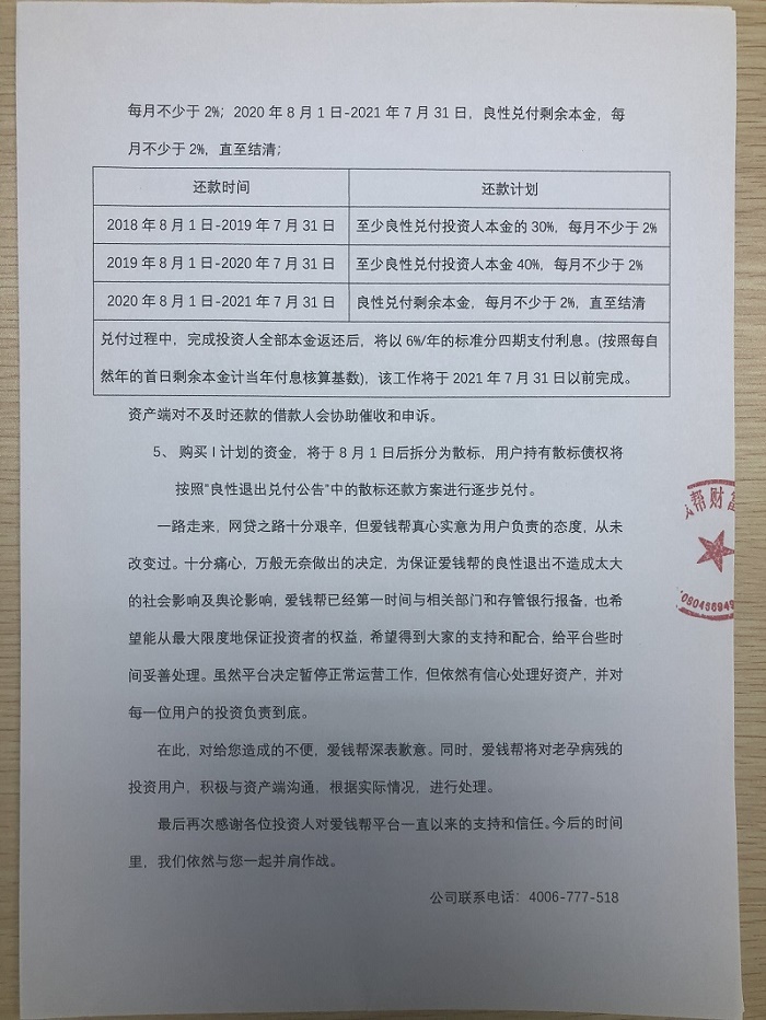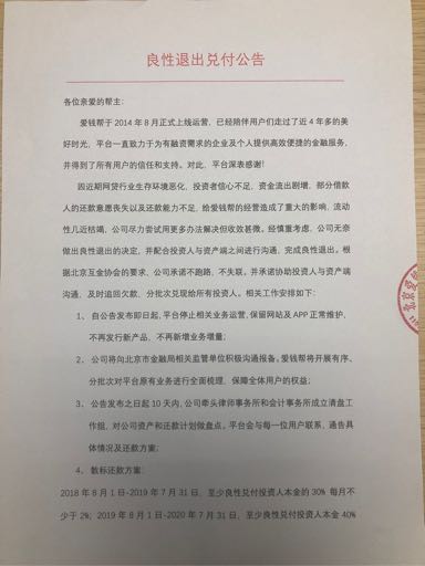 爱钱帮 2018.7.20-23:14……良性退出兑付公告,清退周期3年……清盘公告下架了,昨晚二鬼子找上门商讨结果,跟东银一个样,延缓死亡时间……能不能不说风凉话