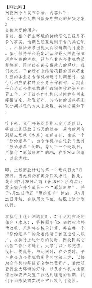 网传一份网投网运营团队发布的逾期解决方案:按周垫付回款,每周5%,20周结清。