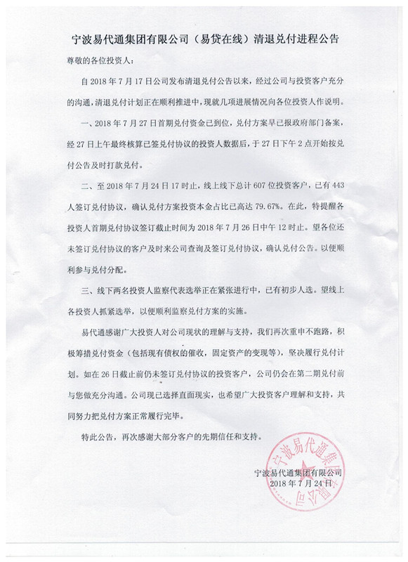 易贷在线 2018.7.24-17:32……宁波易代通集团有限公司(易贷在线)清退兑付进程公告