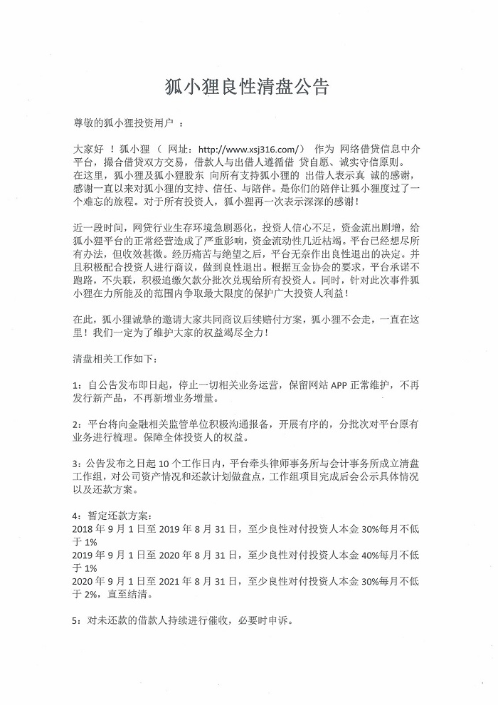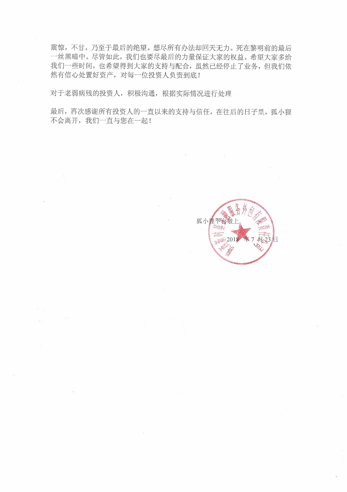 狐小狸理财 2018.7.23-17:34……狐小狸良性清盘公告……震惊,不甘,乃至于最后的绝望。想尽所有办法却回天无力。在黎明前的最后一丝黑暗中