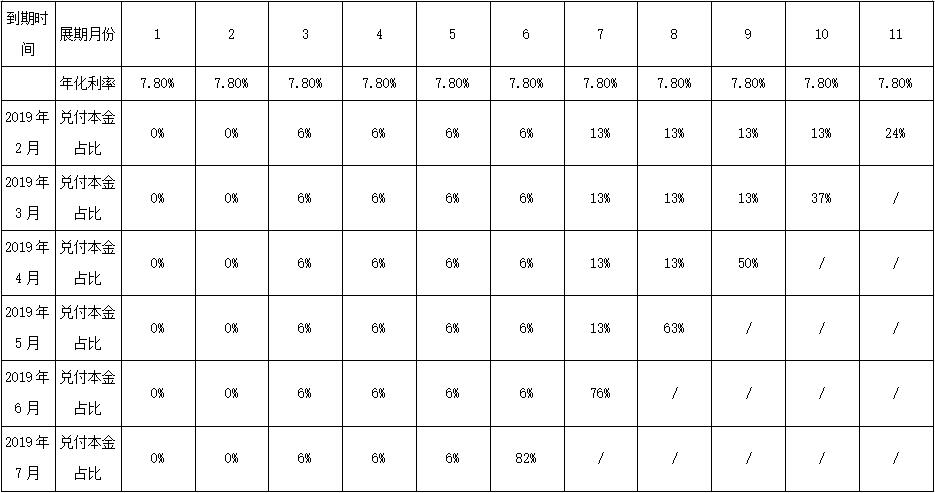 2. 2019年2月1日——2019年7月31日到期的客户,每天所有到期标的,利息部分全部兑付,本金不兑付,统一自动展期至2020年1月31日为止全部兑付完毕。展期期间按照7.8%的年化每月计息,每月付息。自第三个月起按照以下标准兑付本息。具体兑付方案如下: