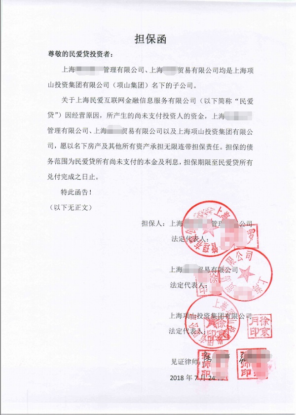 民爱贷 2018.7.25-17:07……项山集团及子公司就民爱贷兑付方案实施的担保函