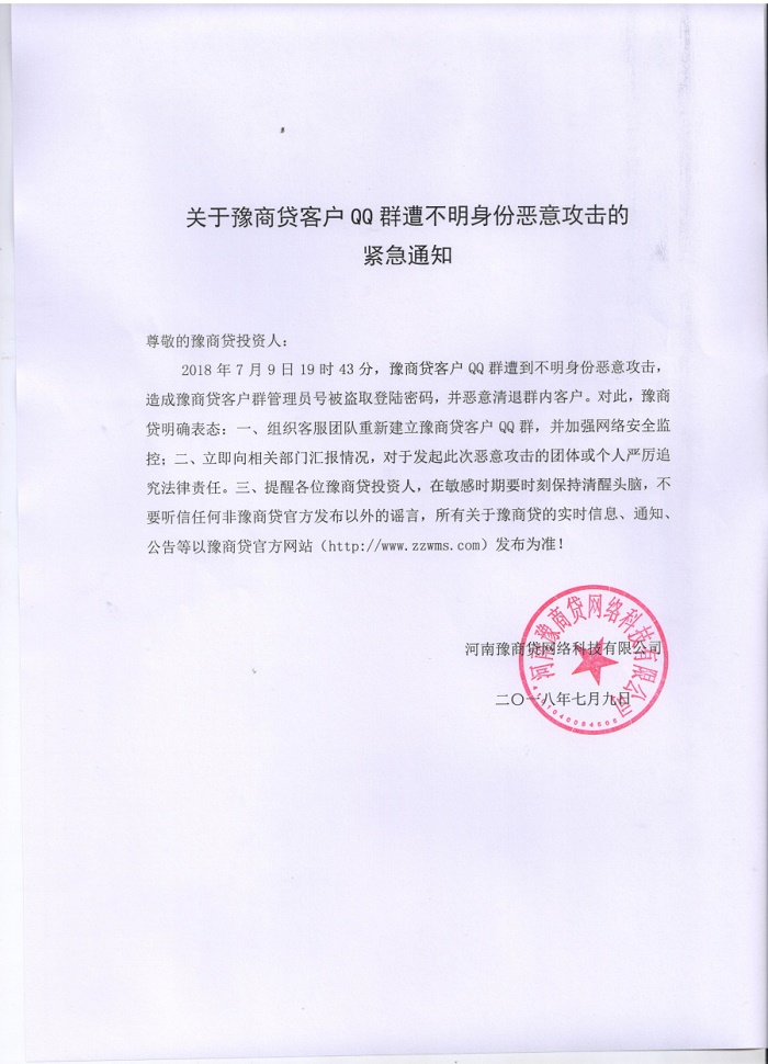 豫商贷 2018.7.9-12:11……关于豫商贷客户QQ群遭不明身份恶意攻击的紧急通知