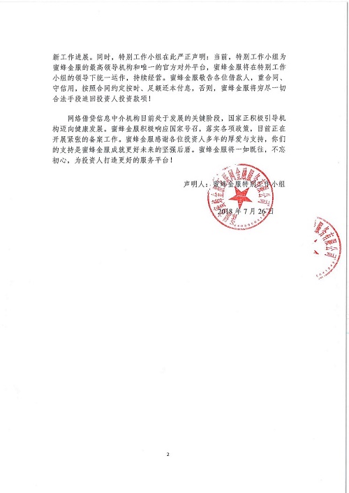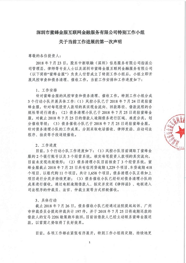 蜜蜂有钱 2018.7.26-10:53……深圳市蜜蜂金服互联网金融服务有限公司特别工作小组关于当前工作进展的第一次声明