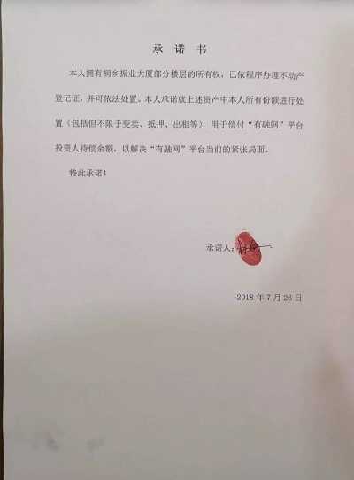 我们再来看看27号有融网又出了一个公告,在该公告中给出一份承诺书,承诺人:杜敏!如下