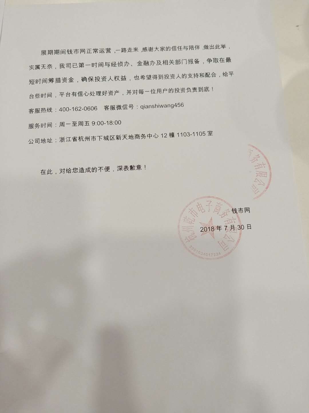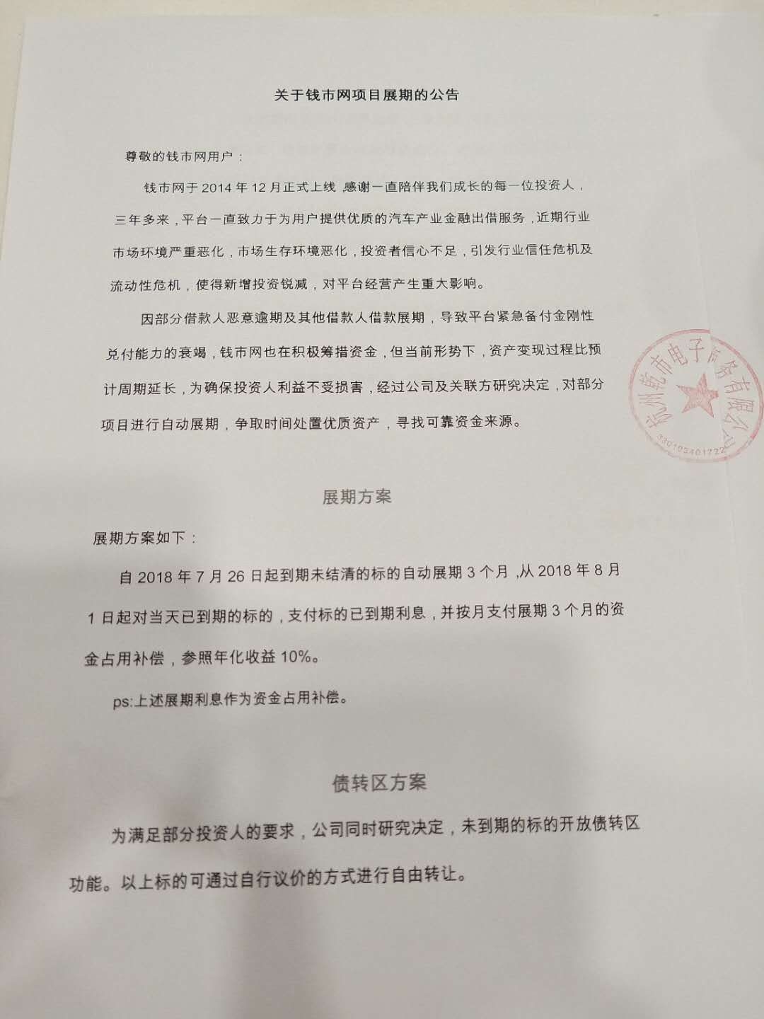 钱市网 2018.7.30-18:13……关于钱市网项目展期的公告