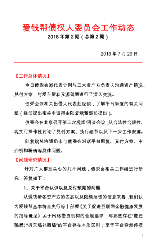 爱钱帮 2018.7.30-0:50……爱钱帮债权人委员会工作动态 2018年第2期(总第2期)……至于平台突然停摆乃至经侦立案与实际控制人和管理层的不尽职,导致投资人恐慌等存在一定关联