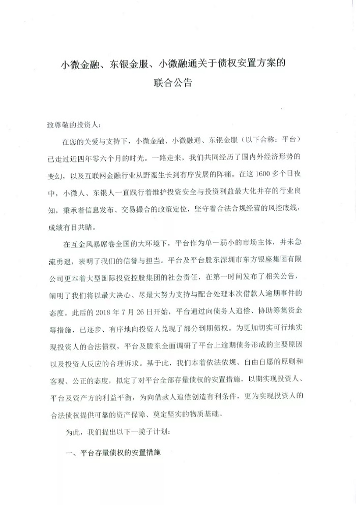 东银金融、小微金融 2018.7.31-0:18……东银金服关于小微金融、小微融通、东银金服投资人债权安置方案