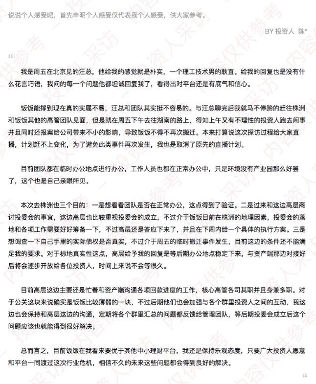 饭饭金服 2018.7.29-21:17……我是周五在北京见的汪总,他给我的感觉就是朴实,一个理工技术男的耿直