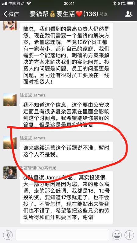 爱钱帮 2018.7.31-12:40……陆总,我们看到的最高负责人仍然是您,现在我们需要一个最终的解决方案,投资人的问题是问题,员工的问题更是问题