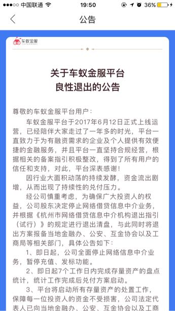 车蚁金服 2018.7.30-19:50……关于车蚁金服平台良性退出的公告