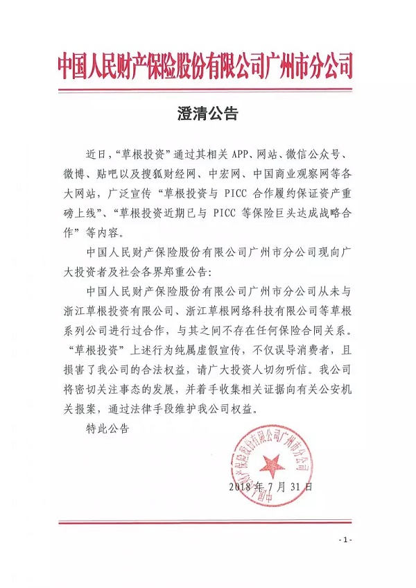 中国人民财产保险股份有限公司广州市分公司从未与浙江草根投资有限公司、浙江草根网络科技有限公司等草根系列公司进行过合作,与其之间不存在任何保险合同关系。“草根投资”上述行为纯属虚假宣传,不仅误导消费者,且损害了我公司的合法权益,请广大投资人切勿听信。我公司将密切关注事态的发展,并着手收集相关证据向有关公安机关报案,通过法律手段维护我公司权益。