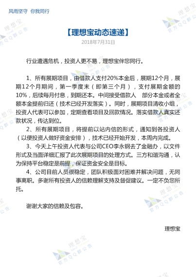 理想宝 2018.7.31-21:29……所有展期项目,由借款人支付20%本金后,展期12个月……今天上午投资人代表与公司CEO李永钢去了金融办汇报此次展期项目的处理方式