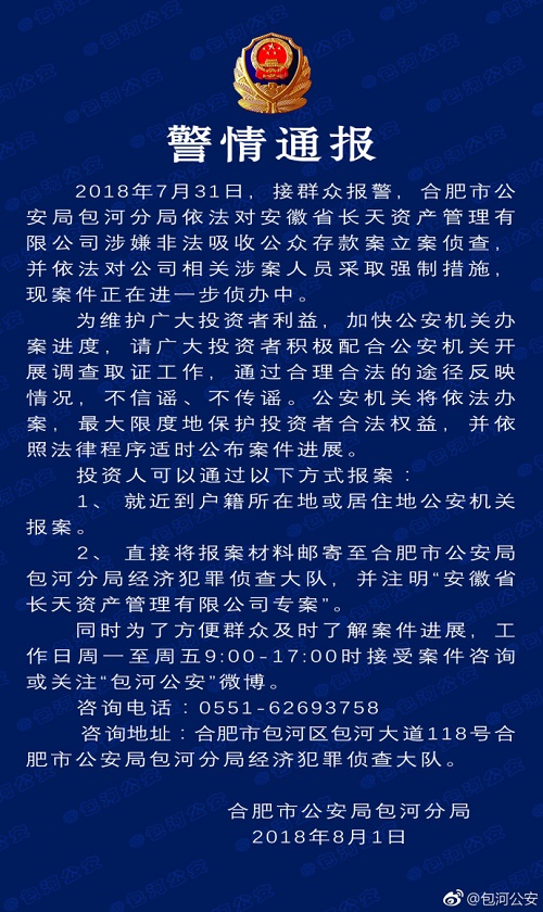 好车贷 2018.8.1-13:05……2018年7月31日,合肥市公安局包河分局依法对安徽省长天资产管理有限公司涉嫌非法吸收公众存款案立案侦查,投资人可以通过以下方式报案: 1、 就近到户籍所在地或居住地公安机关报案。 2、 直接将报案材料邮寄至合肥市公安局包河分局经济犯罪侦查大队,并注明“安徽省长天资产管理有限公司专案”