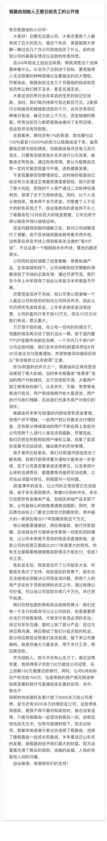 i财富 2018.8.2-9:00……极路由创始人王楚云给员工的公开信……受2017年开始合作的i财富“突然在6月20日发出兑付困难通知,并很快被深圳福田经侦以’非法吸收公众存款罪’立案”影响,公司正常经营活动受到极大影响……核心销售渠道被封、供应商催款、银行货款到期、区块链合作方暂停合作等等一切危机同时爆发,让公司本来就不宽裕的现金流直接断裂……王楚云称会坚持到最后一刻,但恐怕也回天乏术,可能随时倒下