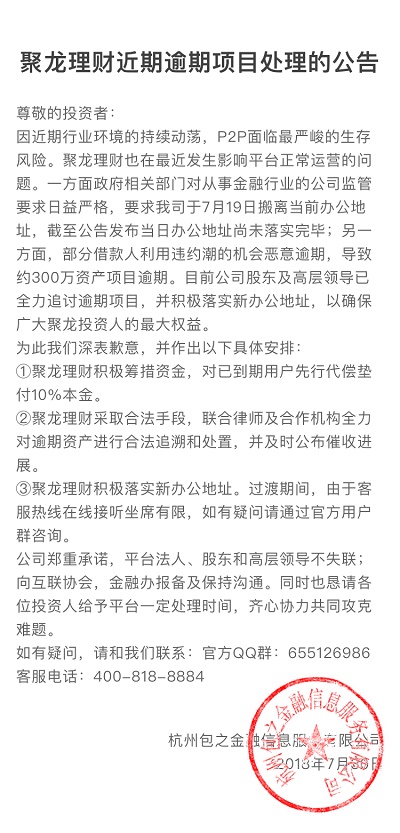 聚龙理财项目逾期公告