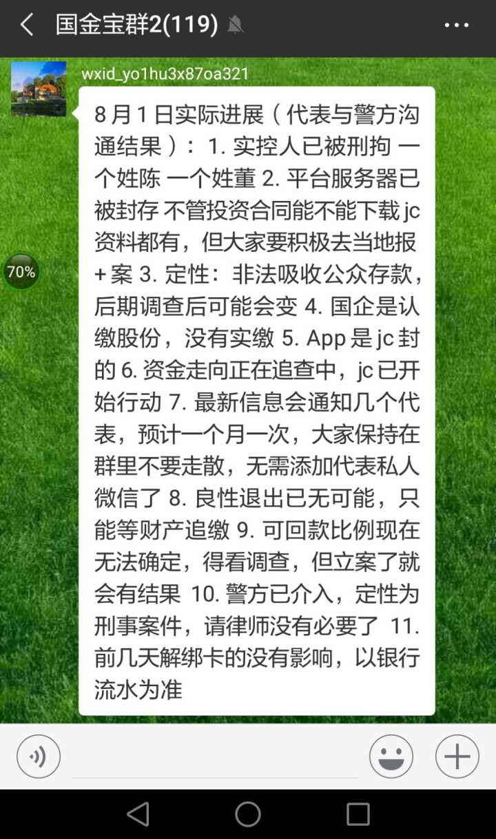 国金宝 2018.8.1-21:01……8月1日实际进展(代表与警方沟通结果)……良性退出已无可能,只能等财产追缴