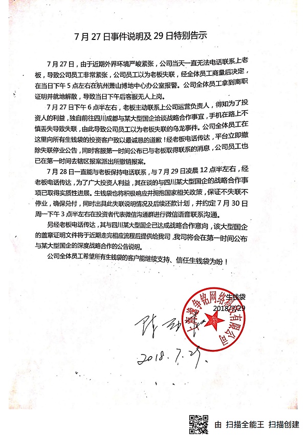 7月27日下午6点半左右,老板主动联系上公司运营人员,得知为了投资人的利益,独自前往四川成都与某大型国企洽谈战略合作事宜,手机在路上不慎丢失导致失联。由此导致公司员工以为老板失联的乌龙事件,公司全体员工在这里向所有生钱袋的投资客户致以最诚恳的道歉!经老板电话传达,平台立即撤除失联停业公告,同事客服第一时间公布已与老板取得联系的消息,公司员工也已在第一时间去辖区报案派出所撤销报案。