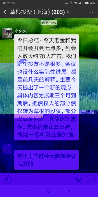 草根投资 2018.8.4-23:20……今天的会议没什么实质进展……主要今天提出了一个新的观点,具体内容为展期三个月到期后,部分债权转为草根的股权