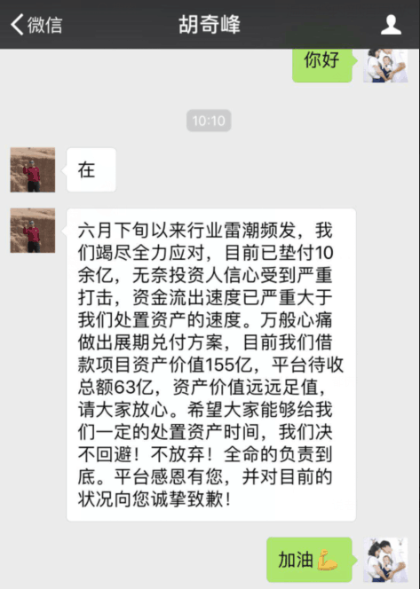 温商贷 2018.8.5-12:08……胡奇峰:我们竭尽全力应对,目前已垫付10余亿,万般心痛做出展期兑付方案……资产价值远远住足值