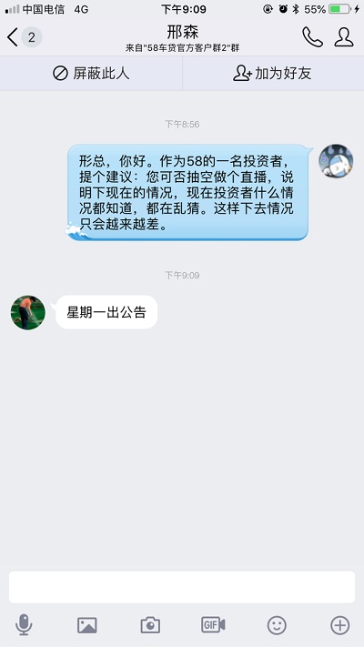 58车贷 2018.8.4-21:17……邢总,您可否抽空做个直播,说明下现在的情况,现在投资者都在乱猜,这样下去情况只会越来越差