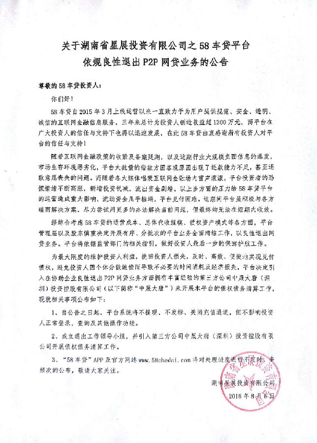 58车贷 2018.8.6-11:06……关于良性退出P2P业务的公告……多方面的压力给58车贷平台的运营造成重大影响,流动资金几近枯竭,平台兑付困难,这期间平台虽积极与各方磋商解决方案,尽力尝试用更多的办法解决当前问题,但最终均无法在短期内收效……经综合考虑58车贷的运营成本,总体待收规模、债权资产模式等各方面,平台管理层以及股东慎重决定开展有序、分批次的平台业务全面清结工作,以退出网贷业务,平台将依据监督部门的相关指引,做好投资人的最后一步保驾护航工作