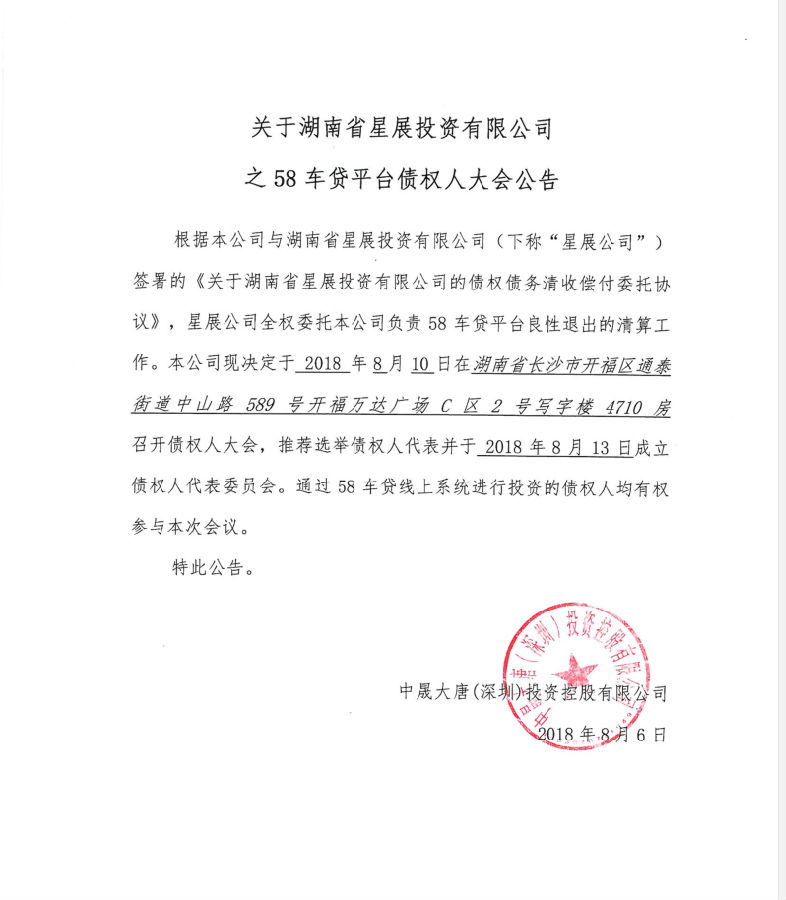 58车贷 2018.8.6-11:16……关于58车贷债权人大会的公告……根据本公司与湖南省星展投资有限公司(下称“星展公司”)签署的《关于湖南省星展投资有限公司的债权债务清收偿付委托协议》,星展公司全权委托本公司负责58车贷平台良性退出的清算工作。本公司现决定于2018年8月10日在湖南省长沙市开福区通泰街道中山路589号开福万达广场C区2号写字楼4710房召开债权人大会