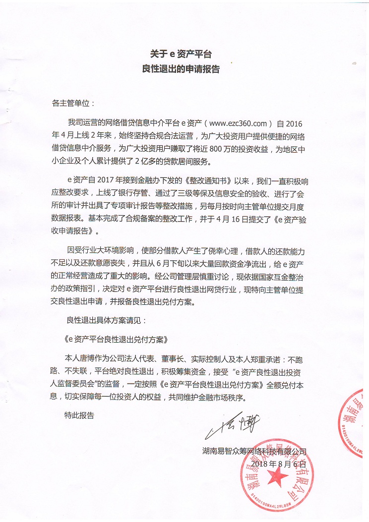 e资产 2018.8.6-23:10……关于e资产平台良性退出的申请报告