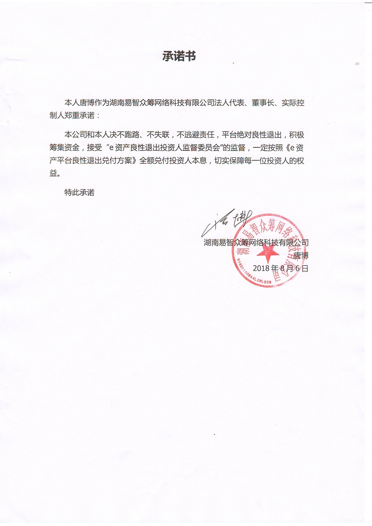 e资产 2018.8.6-23:16……承诺书……本人康博作为湖南易智众筹网络科技有限公司法人代表、董事长、实际控制人郑重承诺
