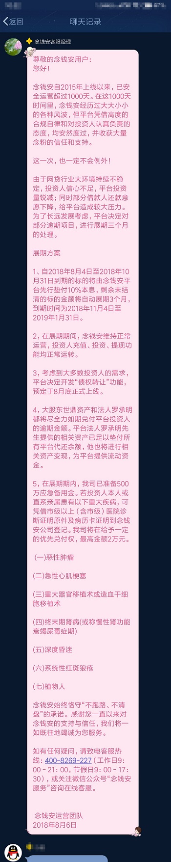 念钱安 2018.8.7-13:19……2018年8月4日至2018年10月31日到期的标的将由念钱安平台先行垫付10%本息,剩余未结清的标的金额将自动展期3个月,到期时间为2018年11月4日至2019年1月31日……在展期期内,公司已准备500万应急备用金。若投资人本人或直系亲属患有以下重大疾病,可凭借市级以上(含市级)医院诊断证明原件及病历卡证明到念钱安公司登记。公司将给予一定的优先兑付权,最高金额2万元