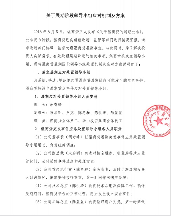 温商贷 2018.8.7-22:07……关于展期阶段领导小组应对机制及方案……温商贷于8月7日正式成立“温商贷展期阶段领导小组”并制定相关应对机制及方案……胡其丰(笔名胡奇峰)