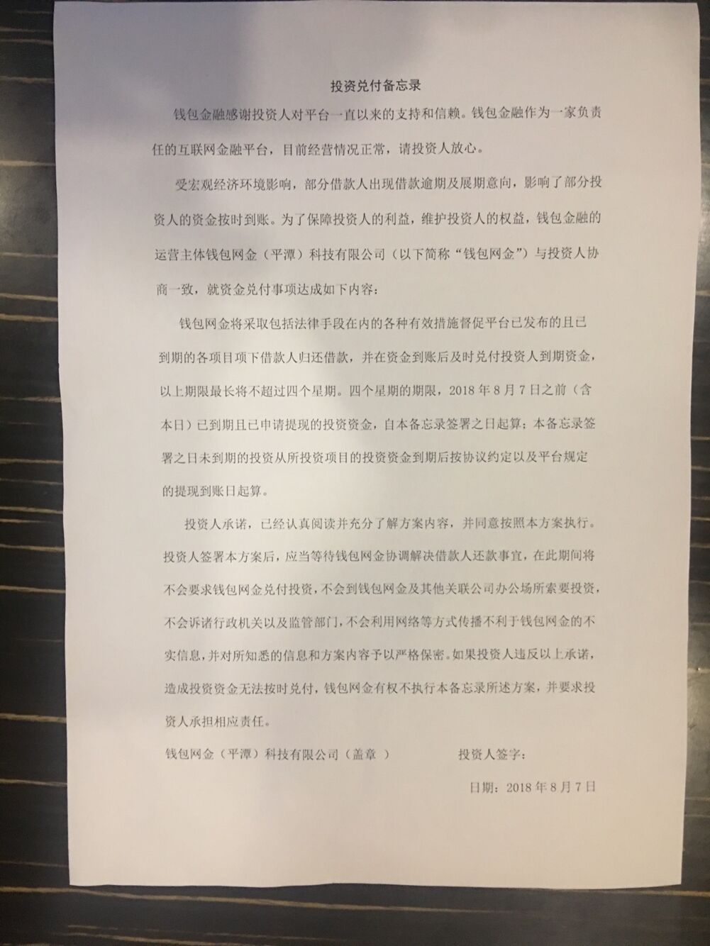 钱包金融 2018.8.7-20:39……投资兑付备忘录……逾期展期期限最长不超过四个星期……投资人对所知悉的信息和方案内容予以严格保密,如果投资人违反以上承诺,造成投资资金无法按时兑付,钱包网有权不执行本备忘录所述方案,并要求投资人承担相应责任