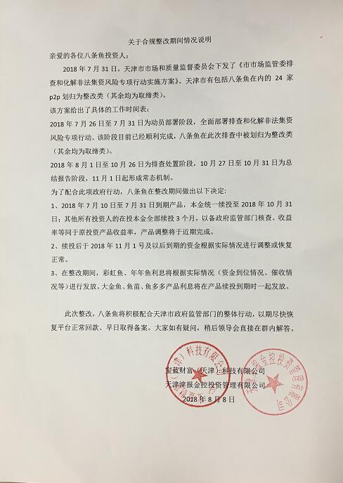八条鱼 2018.8.8-20:02……关于合规整改期间情况说明……八条鱼在天津市此次排查和化解非法集资风险专项行动中被划归为整改类……投资人的在投本金全部续投3个月