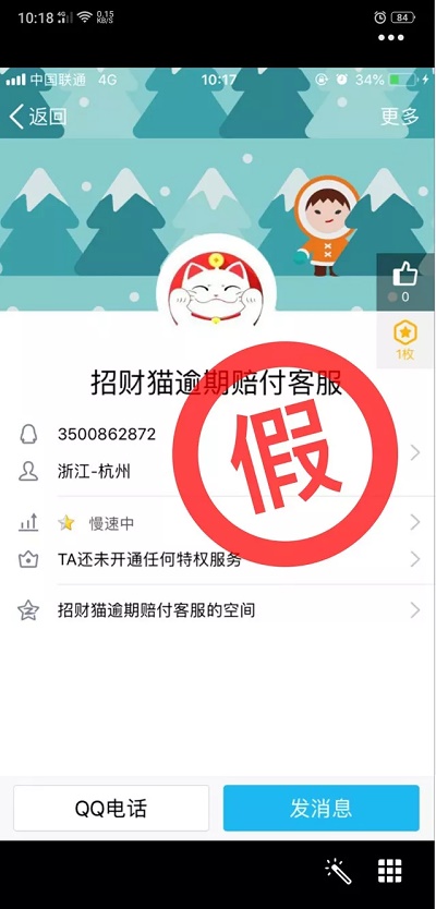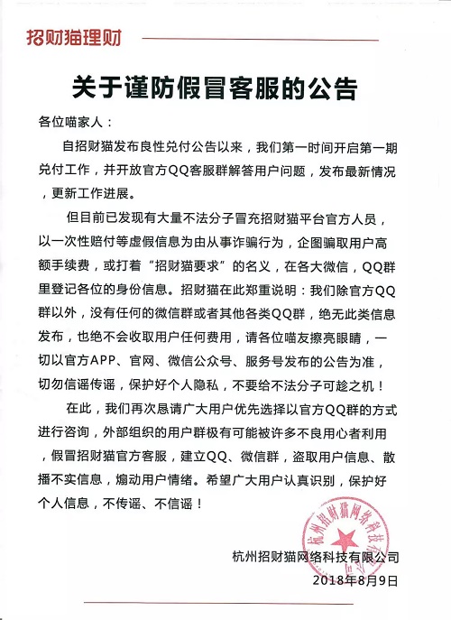 招财猫理财 2018.8.9-16:22……关于谨防假冒客服的公告
