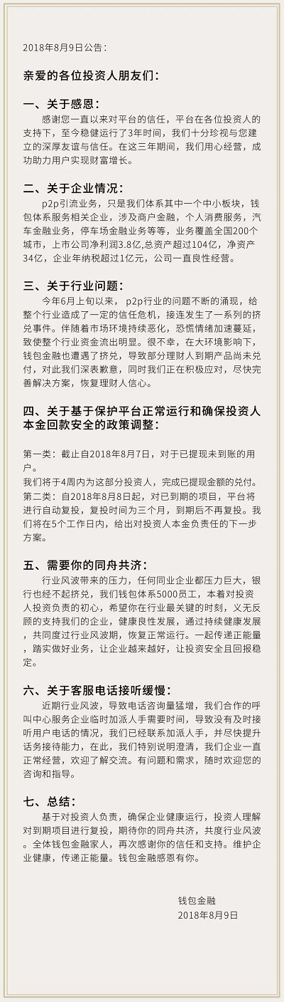 钱包金融 2018.8.10-16:31……奥马电器董事长、钱包金服创始人-赵国栋致投资人……需要你的同舟共济