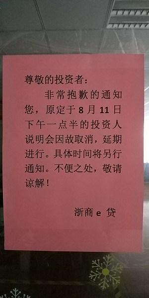 浙商e贷 2018.8.11-10:12……非常抱歉的通知您,原定于8月11日下午1点半投资人说明会因故取消……具体时间另行通知