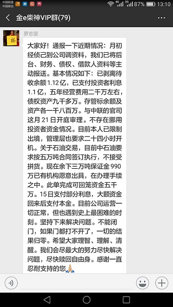有投友说了句实话:大家都不要指望谁,用心慢慢耐心等待,钱老罗应该会还的,只是要时间,至于要多长时间谁都估计不了。所以大家都不要着急了,有空就闲聊一下,了解一下罗总还有没有在上班,有的话就放心等。或者偶尔在有罗的群问问他什么时候有回款就可以了,因为急和报警都没用。只要他肯还的话就就等等吧!我们也是只投了老罗的平台,数额也不算少,不幸中的万幸就是罗没有关门大吉。我们是相信他会还钱的,至于怎么还还多少也不好猜,至于油不油的事情也没有说的必要了,大家关心的是人民币,用什么方式弄回来我觉得也不是我们关心的问题。