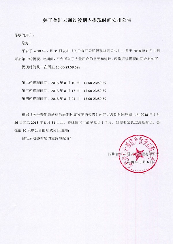 普汇云通 2018.8.7-17:37……关于普汇云通过渡期内提现时间安排公告