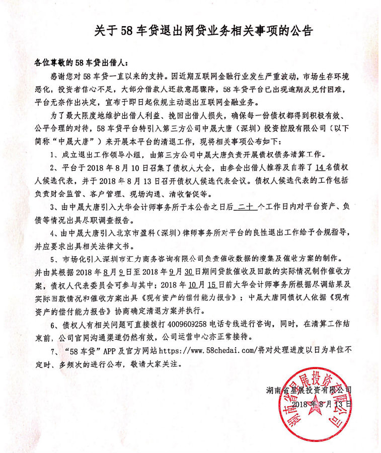 58车贷 2018.8.13-17:44……关于58车贷退出网贷业务相关事项的公告