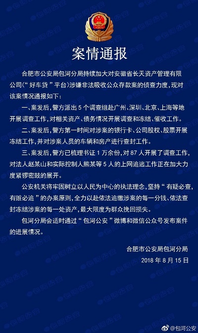 合肥市公安局包河分局持续加大对安徽省长天资产管理有限公司(“好车贷”平台)涉嫌非法吸收公众存款案的侦查力度,全力做好追赃挽损工作,保护群众的合法利益,现对该案情况做通报如下: