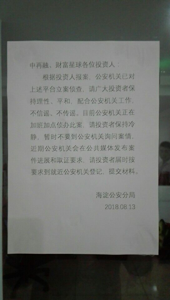中再融、财富星球 2018.8.15-21:13……根据投资人报案,公安机关已对上述平台立案侦查,目前正在加班加点侦办此案