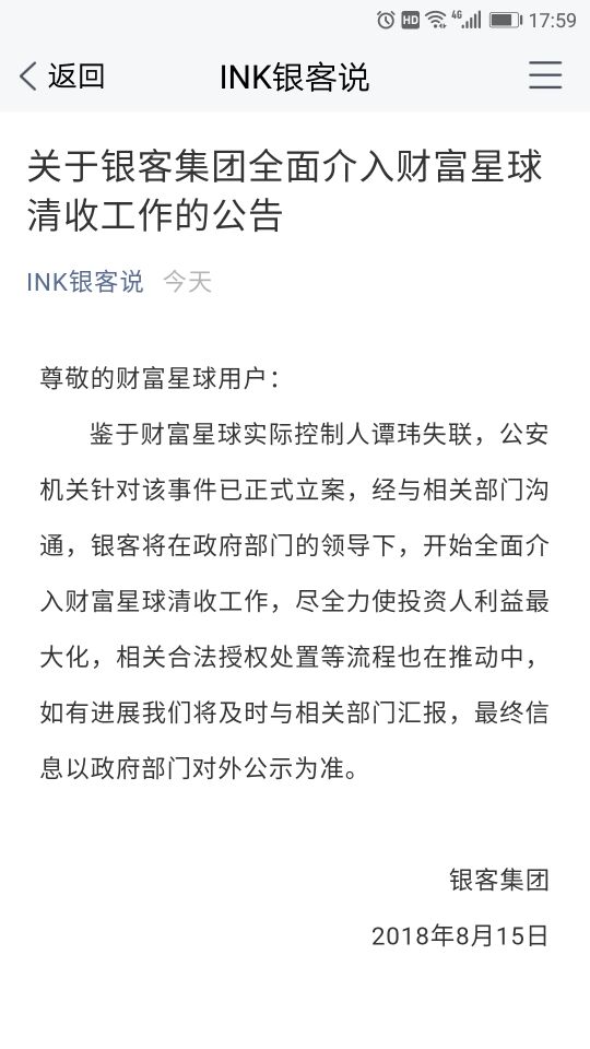 INK银客、财富星球 2018.8.15-18:18……关于银客集团全面介入财富星球清收工作的公告……不报案那老狐狸怎么会妥协……银客和投资人吵架那么厉害,银客不会轻易妥协,小心套路