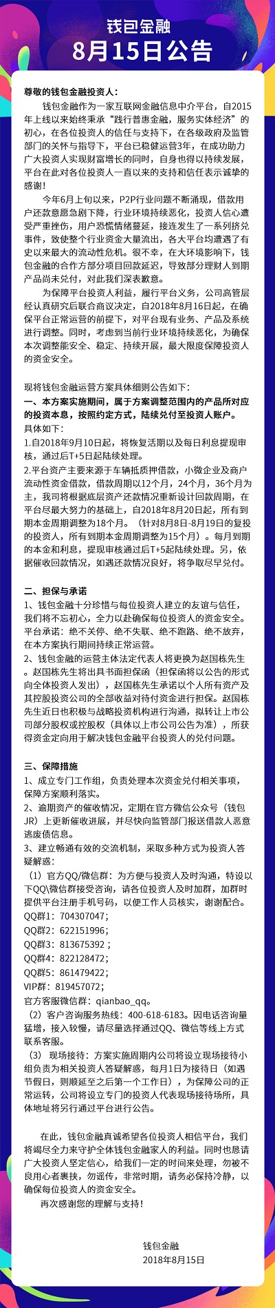 钱包金融 2018.8.15-23:49……钱包金融午夜发布逾期后运营方案具体细则……所有到期本金周期调整为18个月