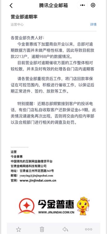 今金贷 2018.8.16-7:34……我在今金贷上班2年,公司已经开始大批量辞退员工,我也让辞退了,老板也正在收拾行囊,目前因为逾期率太高已经到1半了……(内部邮件曝光)今金普惠线下加盟商自开业以来,总部对逾期数据方面并未做严格性标准,因此导致目前放款2213户,逾期988户的数据情况……你有什么仇什么怨啊!做人这么龌蹉,你这人品到哪混