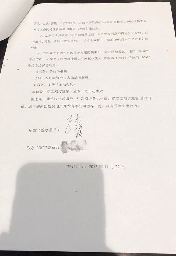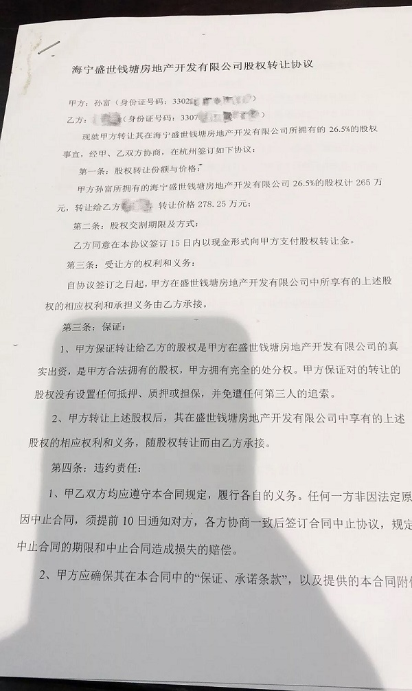 海宁盛世钱塘房地产开发有限公司所拥有的这个地块,最初为孙富和他弟弟孙裕等人购入。但在后期开发中,由于资金短缺,曾一度暂停开发,且后因诉讼、纠纷等多重压力,孙富等人于2013年11月22日将公司股权转让给了我和另一位同事,签了协议,转让款也已经支付给了他们。但由于诉讼未完成的原因,工商变更尚未完成,公章也还没有移交。