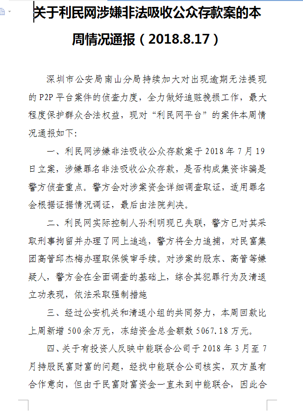 利民网 2018.8.17-18:29……关于利民网涉嫌非法吸收公众存款案的本周情况通报……利民网实际控制人孙利明现已失联,警方已网上追逃全力追捕