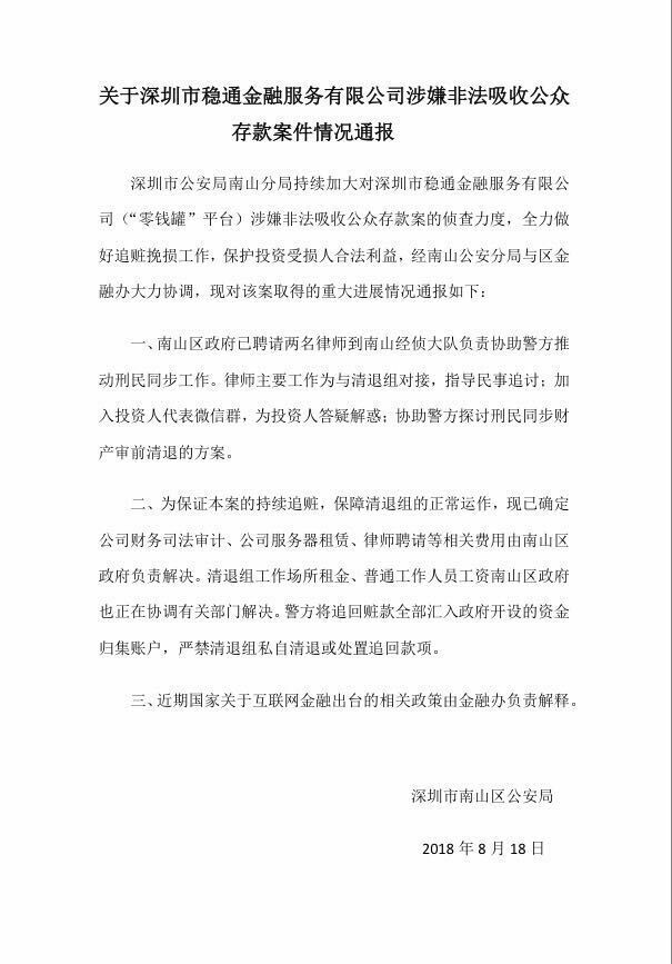 零钱罐 2018.8.18-18:54……深圳市公安局南山分局持续加大对零钱罐平台涉嫌非法吸收公众存款案的侦查力度,全力做好追赃挽损工作
