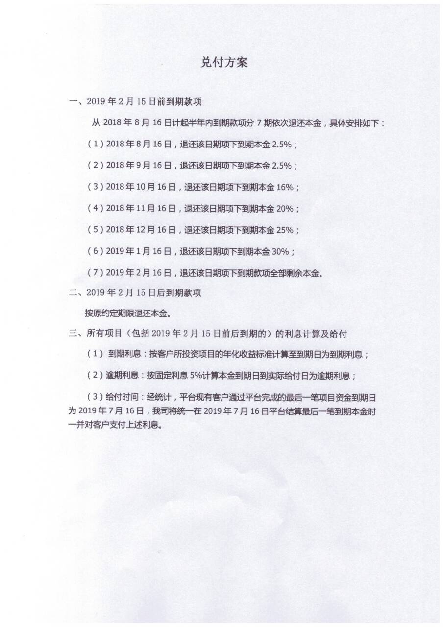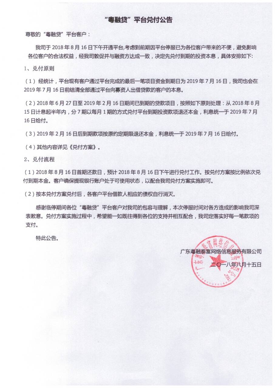 粤融贷 2018.8.16-1:04……粤融贷兑付公告、兑付方案……8.16凌晨平台发出兑付公告……粤融贷隶属于广东粤融泰富网络有限公司,6.27出现了停服状态,第一次公告通知7.15开服,随后公司立马从佛山搬迁至注册地肇庆四会,到了7.15下午6点,粤融贷平台再次发出公告,称存管上线技术对接理由将开服时间再次拖延至8.16,随后部分借资人陆陆续续前往四会了解公司实情,希望公司负责人露面说清楚公司现状,如资金有问题借资人愿意共同度过问题,但是无果