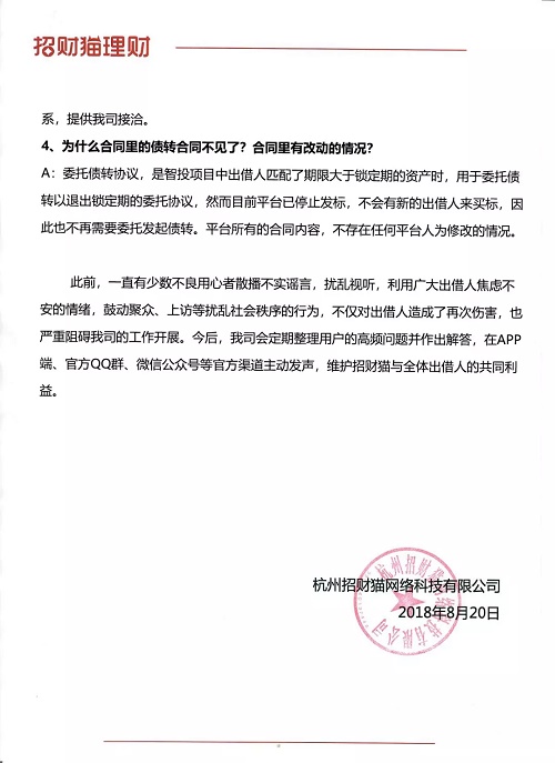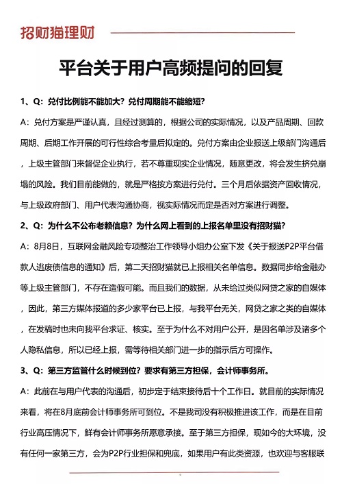 招财猫理财 2018.8.21-11:29……招财猫平台关于用户高频提问的回复……兑付比例能不能加大?兑付周期能不能缩短